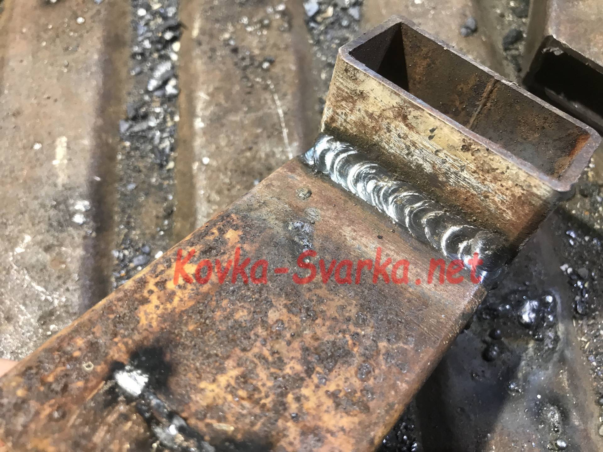 Затем мы соединяем детали вместе и начинаем сварку. Квадрат отводит тепло, чтобы заготовка не сгорела. Полезная техника для начинающих сварщиков.
