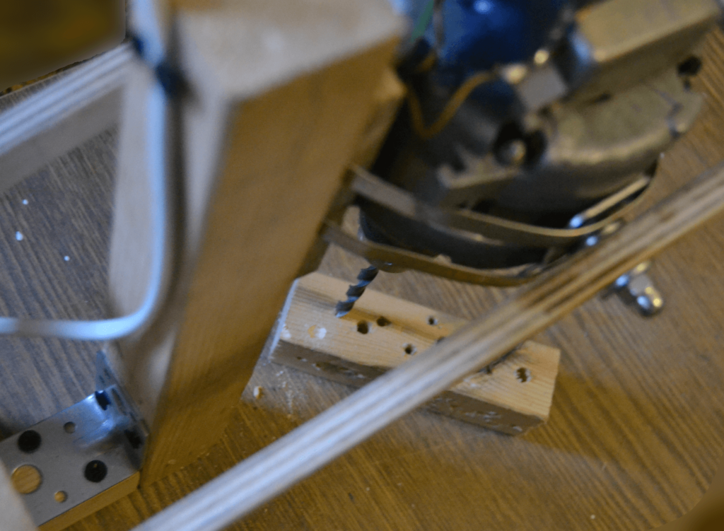 После установки всех элементов проверяем качество и надежность креплений. Подставляем уголок к разным сторонам конструкции и смотрим, чтобы сверло располагалось строго перпендикулярно основе. Иначе работать на станке будет сложно.