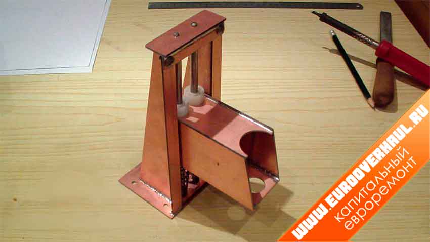 Его можно изготовить из домкрата, служащего стойкой, приваренной к массивной пластине из стали, нескольких полос металла, швеллера. Вместо дрели допускается использовать шуруповерт. Приспособление простое в сборке и не требует больших денежных вложений. Для лучшей устойчивости его прикручивают к столешнице стола.