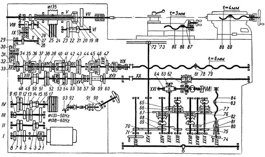 Шпиндель получает 18 ступеней частот прямого и обратного вращения от шестиваловой коробки скоростей в передней бабке станка. Установка нужной скорости осуществляется тремя рукоятками на передней стенке передней бабки.