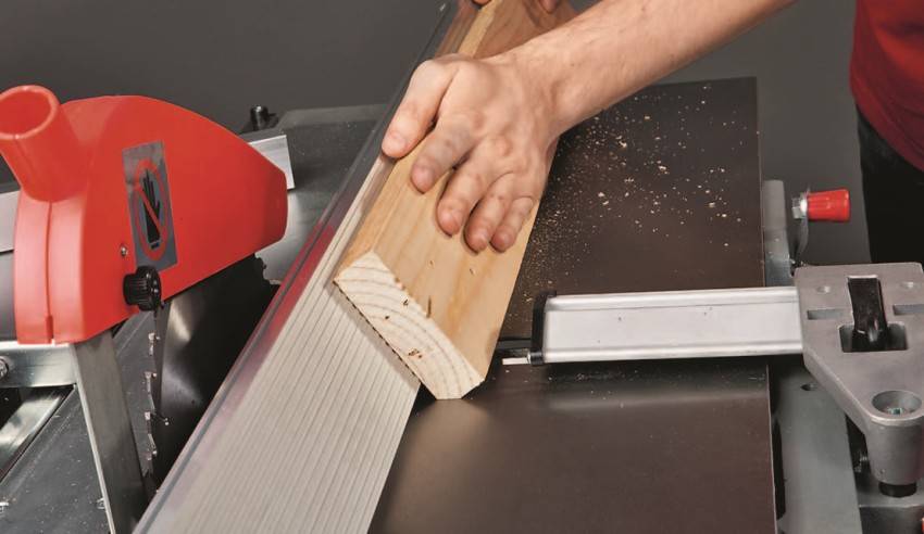 Если работающий на станке правша, то полка для циркулярной пилы должна быть расположена по правой кромке стола, чтобы была возможность закрепить на столе заготовку.
