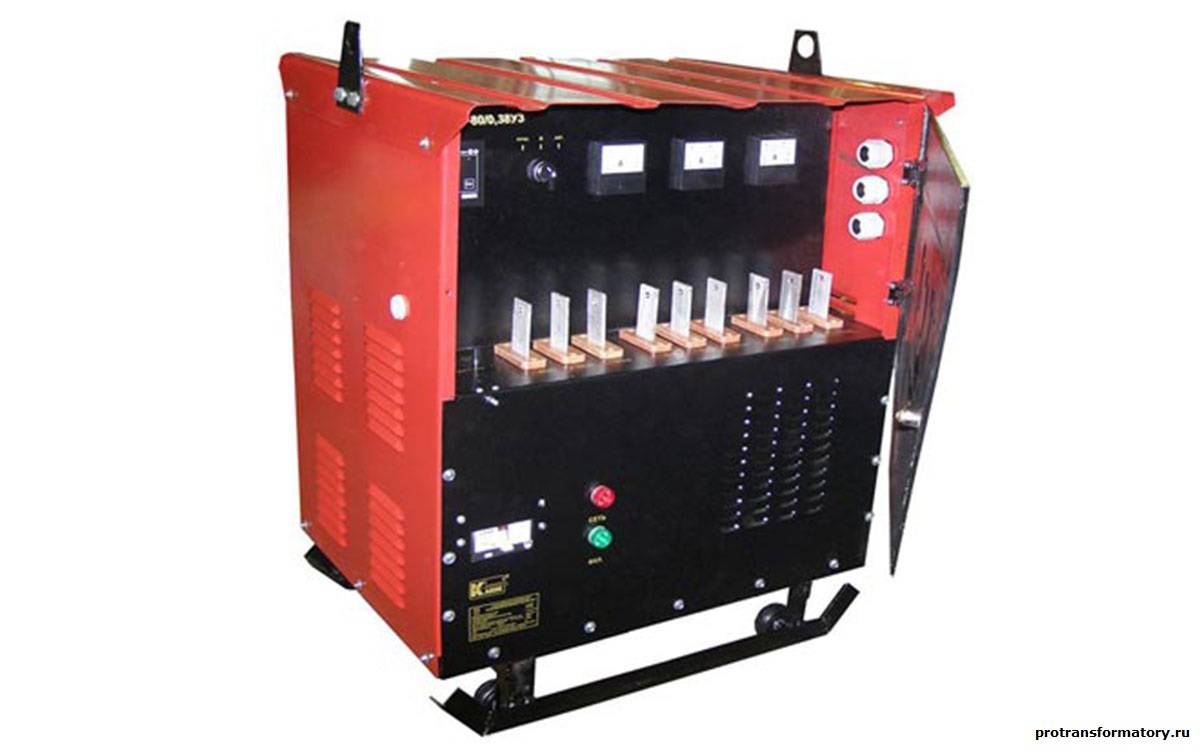 Эта конструкция представляет собой масляный 3-фазный трансформатор. У нее есть 5 ступеней переключения напряжения (минимальное — 55 В, а максимальное — 95 В). Подключать оборудование можно в сеть с напряжением в 380 В и в 42 В.