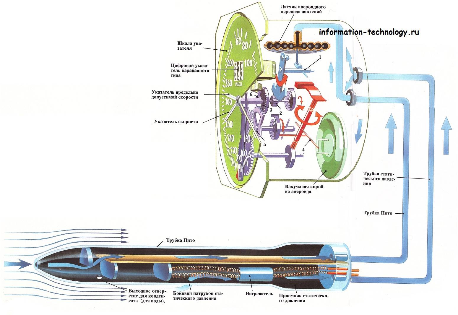 Такой указатель измеряет скорость движущихся в воздухе объектов по отношению к скорости распространения звука в воздухе. Измеряется перепад давлений между открытым концом трубки Пито и в боковом патрубке постоянного давления. И все эти изменения давления отражаются на показаниях измерителя скорости.