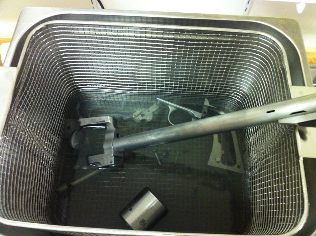 В нашем случае достаточно будет положить деталь в ультразвуковую ванну и включить устройство.