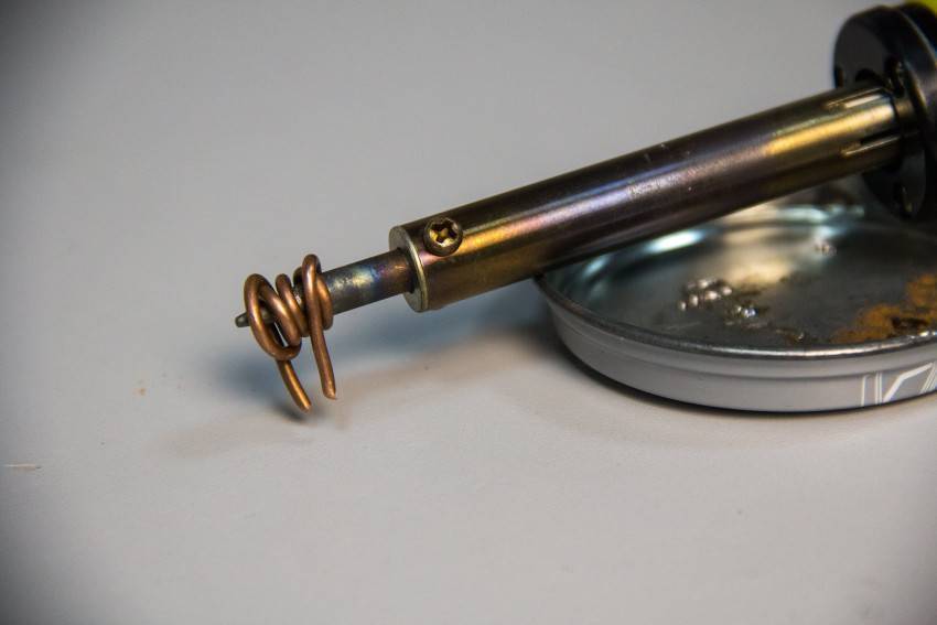 Условно 60 лет назад выпускали больше паяльники. Не каждый КТ315 выдерживал огромные жала, которые нагревались до 380 ℃. Радиолюбители паяли как могли. Кто-то собирал регулятор температуры на симисторах. А кто-то наматывал медную проволоку поверх жала, предварительно залудив край проволоки.