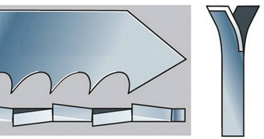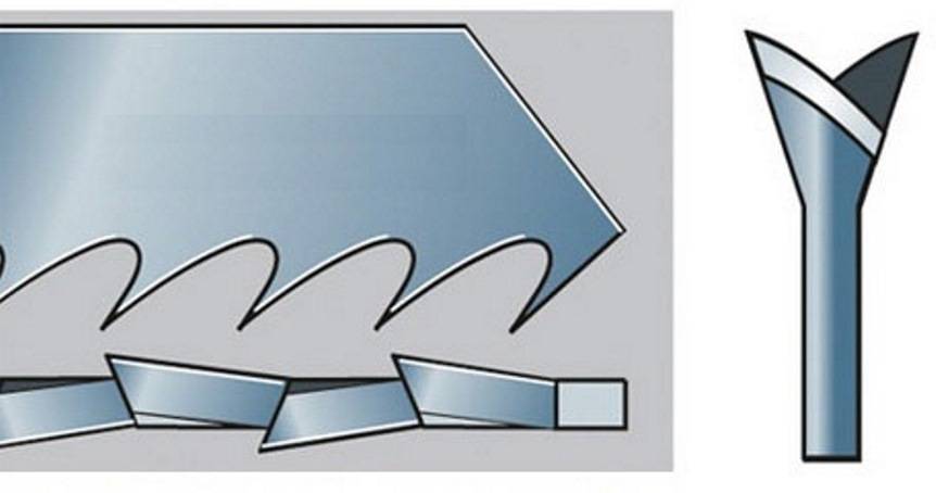 Зубья такой оснастки отшлифованы и разведены по обе стороны от полотна. В результате выполняемые ею резы бывают, как правило, довольно широкими.