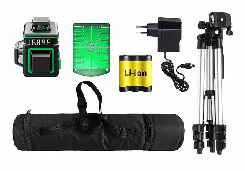 Устройство снабжено функцией самоотключения и самонивелирования в пределах 4,5 градусов, способно работать в широком температурном диапазоне. Монтируется на штатив с помощью резьбы 1/4″ или 5/8″. В качестве питающего элемента используется аккумулятор. Зарядка осуществляется непосредственно подключением прибора к сети, в этот момент он может работать без аккумулятора. В комплекте вы также найдете сумку, зарядку, аккумулятор емкостью 3300 мА, специальное крепление и магнитную мишень.