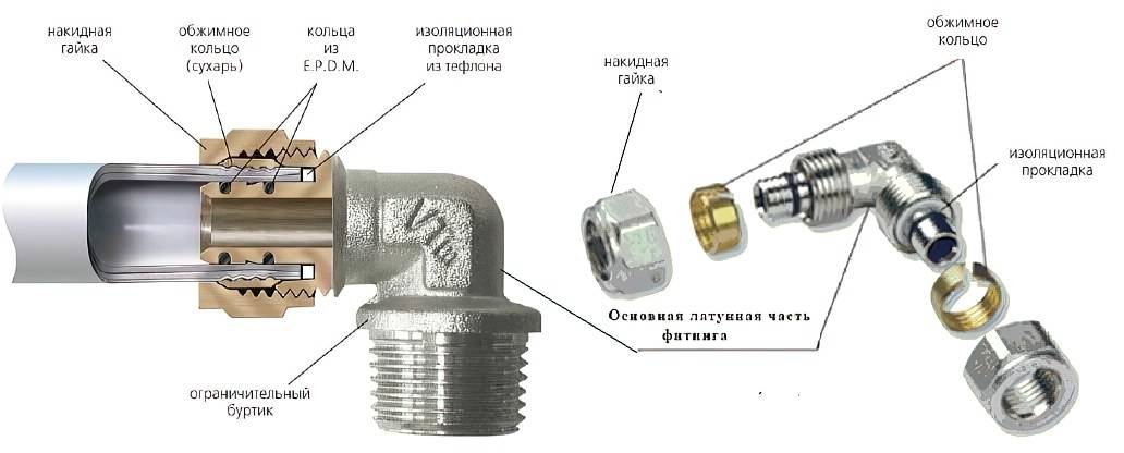 Монтаж металлопластиковых труб на компрессионных фитингах начинается с того, что снимается накидная гайка и обжимное кольцо, проверяется наличие уплотнительной резинки. После этого собственно и начинается сборка: