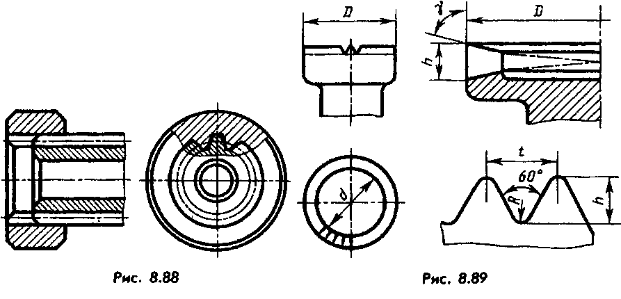 На чертежах, содержащих нестандартизованные шлицевые соединения (например, с треугольным профилем зуба), помещают изображение профиля зуба с впадинами (шлицами) со всеми необходимыми сведениями (рис. 8.89).