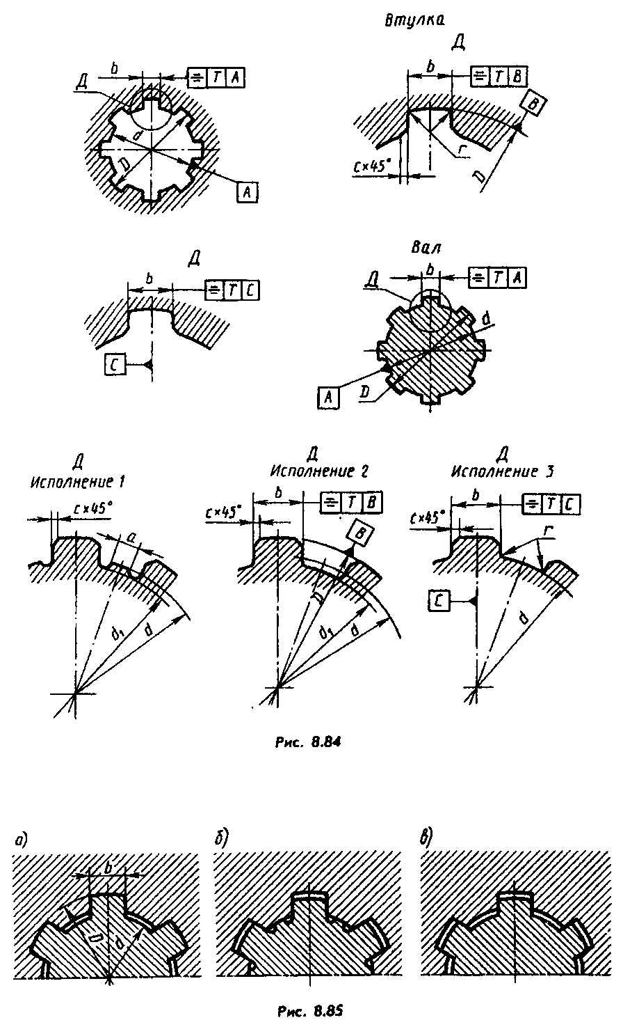 Стандартизованы соединения с прямобочным и эвольвентным профилем зубьев. Наиболее широко применяют первое соединение.Размеры прямобочных шлицевых соединений установлены ГОСТ 1139—80* (СТ СЭВ 187—75 и 188—75), предусматривающим три исполнения — 1, 2, 3 и три серии соединения — легкую, среднюю и тяжелую.Основные параметры: число зубьев z, внутренний диаметр d, наружный D, ширина зуба b (рис. 8.84). Для легкой и средней серии z=6, 8, 10, для тяжелой — 10, 16 и 20.Поверхности зубьев вала и втулки могут соприкасаться (центрироваться) по внешнему диаметру D (с образованием зазора по внутреннему диаметру, рис. 8.85, а), по внутреннему диаметру d (с образованием зазора по наружному диаметру, рис. 8.85, б) и боковыми сторонами зубьев (с образованием зазоров по наружному и внутреннему диаметрам, рис. 8.85, в).Обозначение втулки при центрировании по внутреннему диаметру d:d — 8X36H7X40H12X7D9, где d— указывает вид центрирования; 8 — число зубьев; 36 — внутренний диаметр с полем допуска Н7; 40 — наружный диаметр с полем допуска HI2; 7 — ширина зуба с полем допуска D9; то же, для вала d—8X36e8X X40a11X7f8, где е8, all и f8 — поля допусков d, D, b соответственно.В обозначении не отражается исполнение зуба — A, В или С (приводится на рабочем чертеже или решает технолог), а серию (устанавливает на основе расчета конструктор) определяют значения z, d и D; в данном примере числа 8, 36 и 40 относятся к легкой серии.