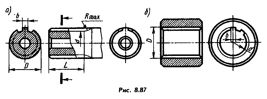 Втулочная муфта представляет собой втулку, надеваемую на концы валов и закрепляемую на них штифтами (рис. 32 а), шпонками (рис. 32 б) или шлицами. Эти втулки имеют простую конструкцию, малые габариты и низкую стоимость. Прочность таких муфт определяется прочностью штифтов и шпонок.